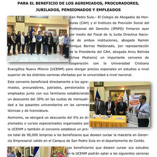 El Colegio de Abogados de Honduras (CAH) junto con el Instituto de Previsión Social del Profesional del Derecho (IPSPD) firmaron importante convenio de cooperación con la Universidad Cristiana Evangélica Nuevo Milenio (UCENM) en donde establecen un 30% de descuento en las cuotas mensuales de los pasantes universitarios en las carreras de licenciatura y técnicas.
