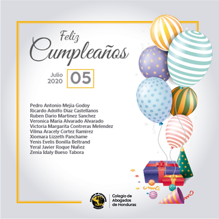 El Colegio de Abogados de Honduras (CAH) se complace en felicitar a todos nuestros agremiados en el día de su cumpleaños. Les deseamos muchas felicidades y que Dios bendiga sus vidas.