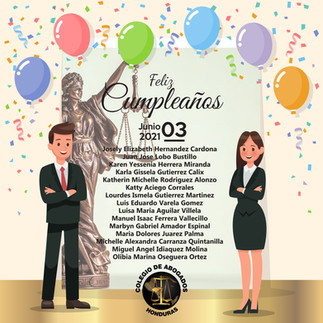El Colegio de Abogados de Honduras (CAH) se complace en felicitar a todos nuestros agremiados en el día de su cumpleaños. Les deseamos muchas felicidades y que Dios bendiga sus vidas.